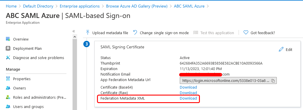 - Under SAML Signing Certificate, Click Download to download the Federation Metadata XML.
