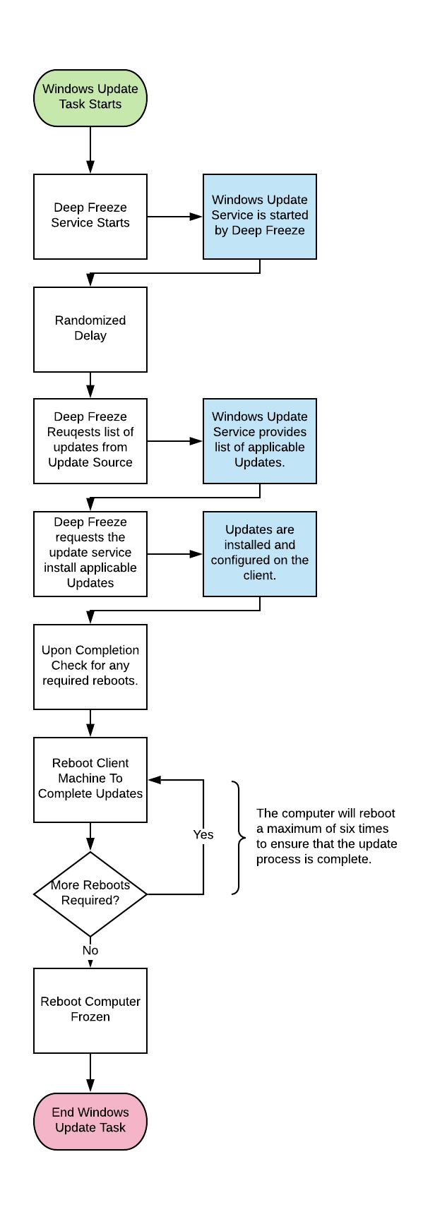 When Deep Freeze is controlling the update process the general flow of operations is as shown below;